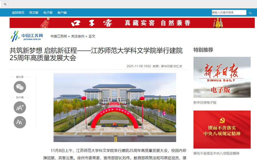 中国江苏网11月8日报道科文学院举行建院25周年高质量发展大会,报道内容如下: