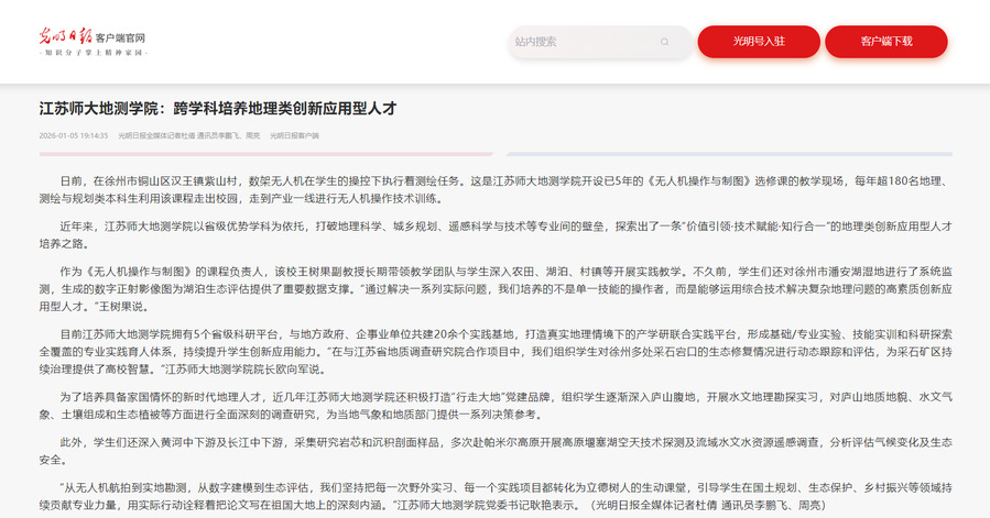 光明日报客户端1月5日关注华体会(中国)地理测绘与城乡规划学院跨学科培养地理类创新应用型人才相关工作,报道内容如下:
